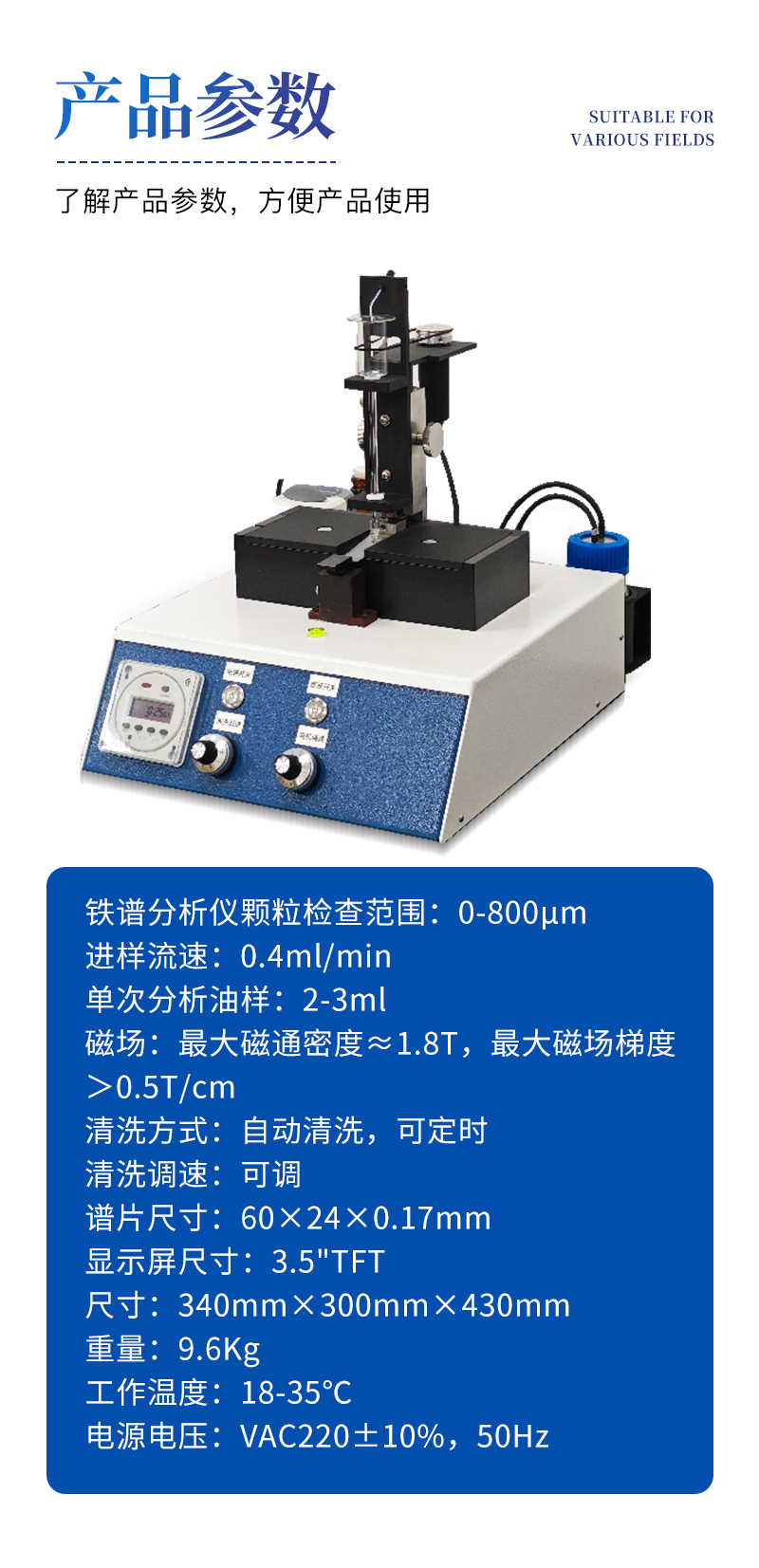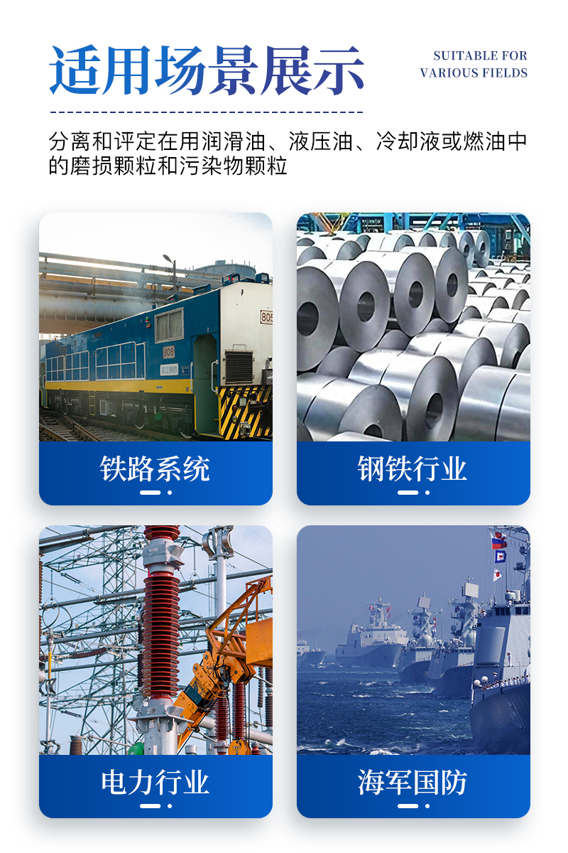 ?。?4)應(yīng)用范圍:用以分離和評定在用潤滑油、液壓油、冷卻液或燃油中的磨損顆粒和污染物顆粒;
