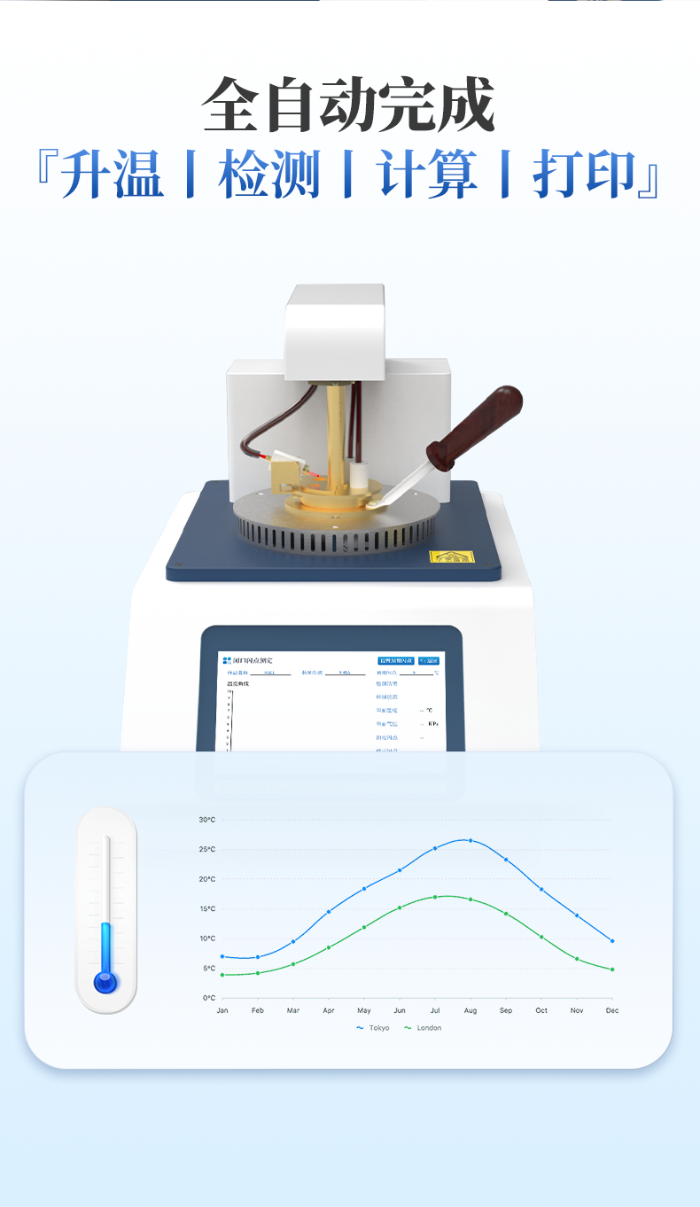 儀器按照GB/T 261-2021方法規(guī)定的升溫曲線加熱,溫度接近預(yù)期閃點(diǎn)值時(shí)自動(dòng)點(diǎn)火,當(dāng)出現(xiàn)閃點(diǎn)時(shí)儀器自動(dòng)鎖定結(jié)果,并顯示和打印,同時(shí)啟動(dòng)風(fēng)機(jī)自動(dòng)對(duì)加熱器進(jìn)行冷卻。